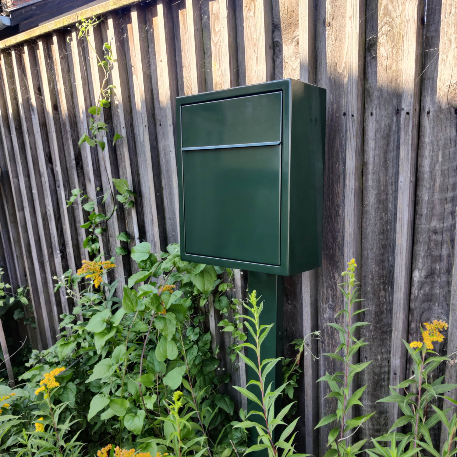 Postkassen er fremstillet af 1,0 mm rustfrit stål, type AISI 430, en ferritisk legering med 16% krom. Dette materiale er særligt velegnet til mildt korrosive miljøer, hvilket sikrer en lang levetid. Den smukke Racing Green pulverlakering i RAL6009 giver ikke kun et elegant og moderne udtryk, men beskytter også mod vejr og vind.