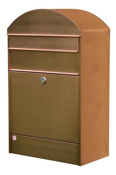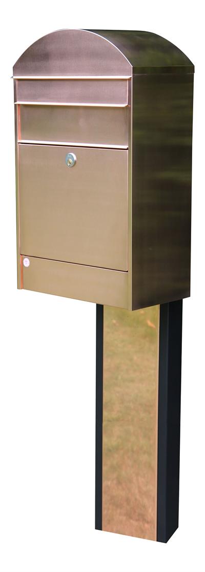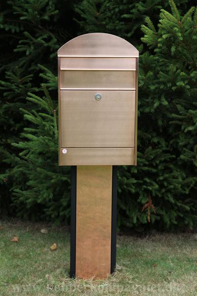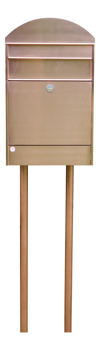 Denne model postkasse kan monteres direkte på muren eller på en flot sort postkasse pladestander med kobberfront, en dobbelt kobber-rørstander kan også benyttes.
