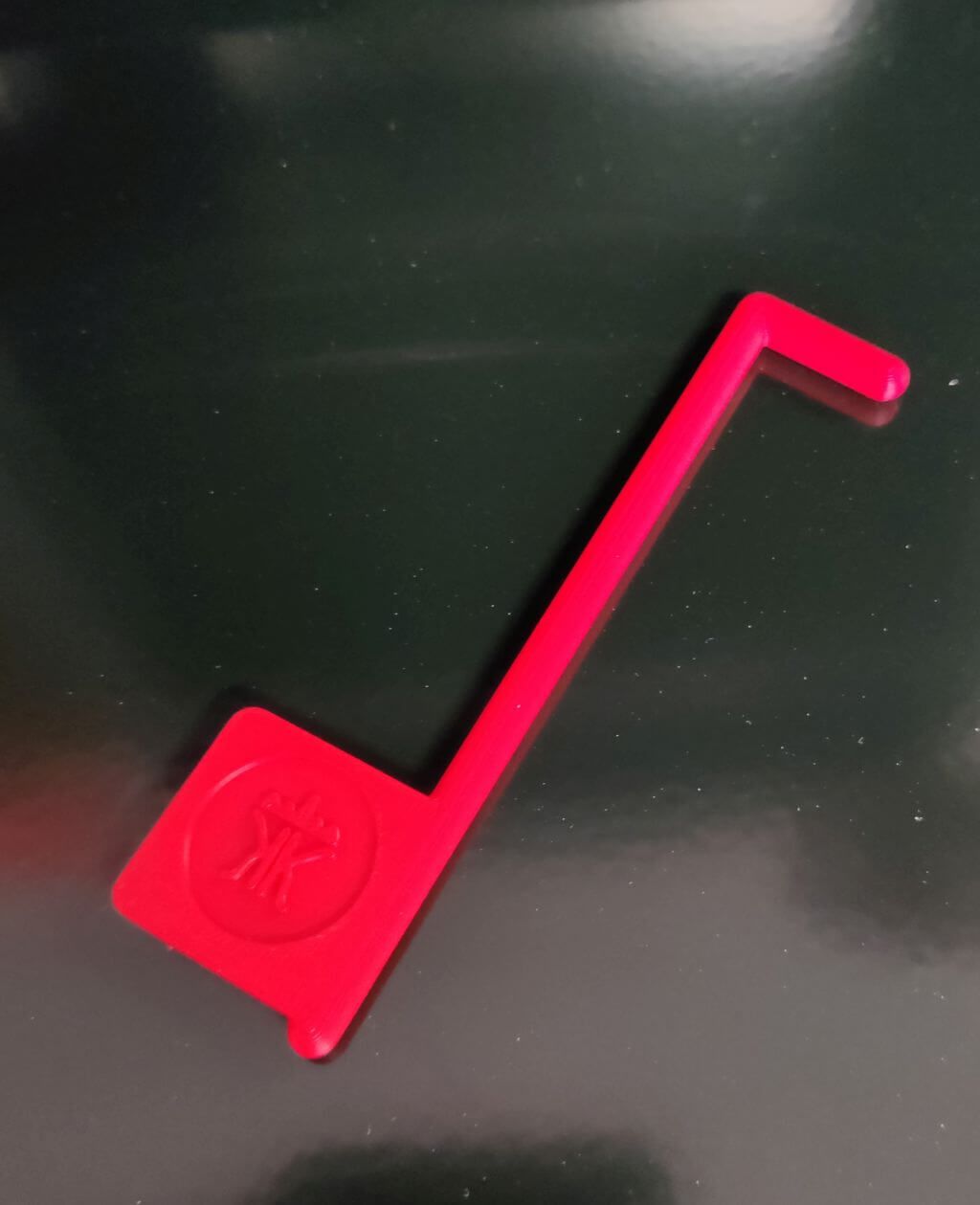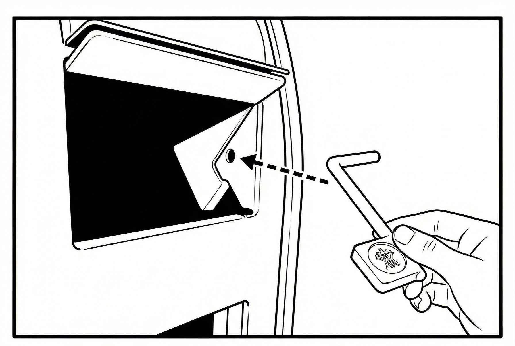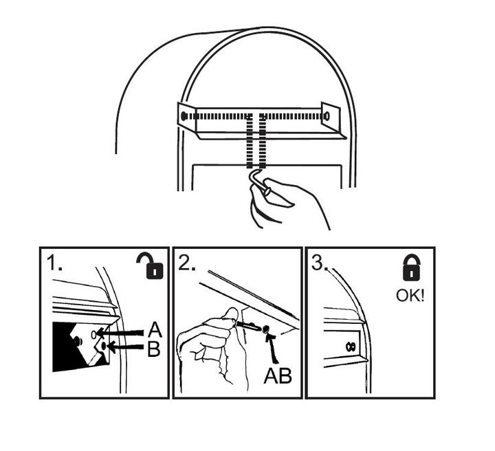* Stikker hånden ind i postkassen og sætter den øverste ombukkede del at aflåsning nøglen ind i hullet i brevindkastet i enten højre eller venstre side, nøglen hænger nu fast i hullet.