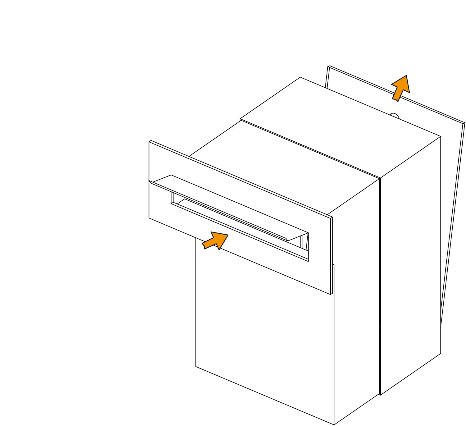 Postkassen leveres i tre dele: frontpanel, indskydningsenhed og kasse med udtagningsdør.