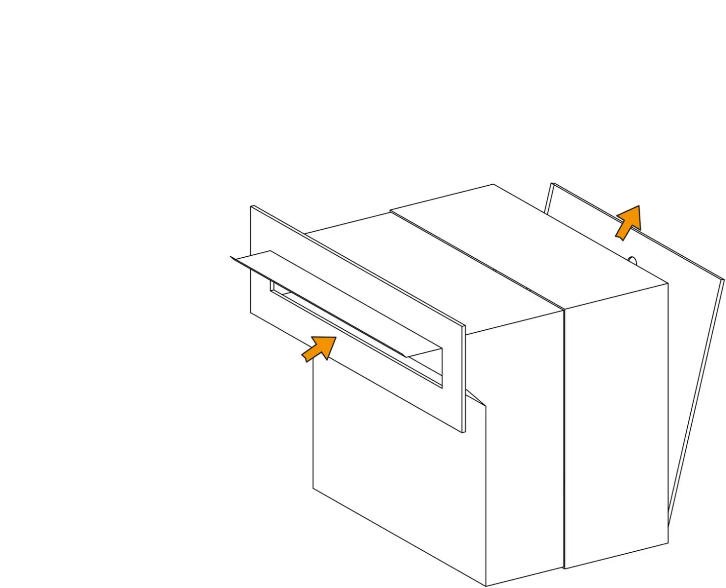 Postkassen leveres i tre dele: frontpanel, indskydningsenhed og kasse med udtagningsdør.